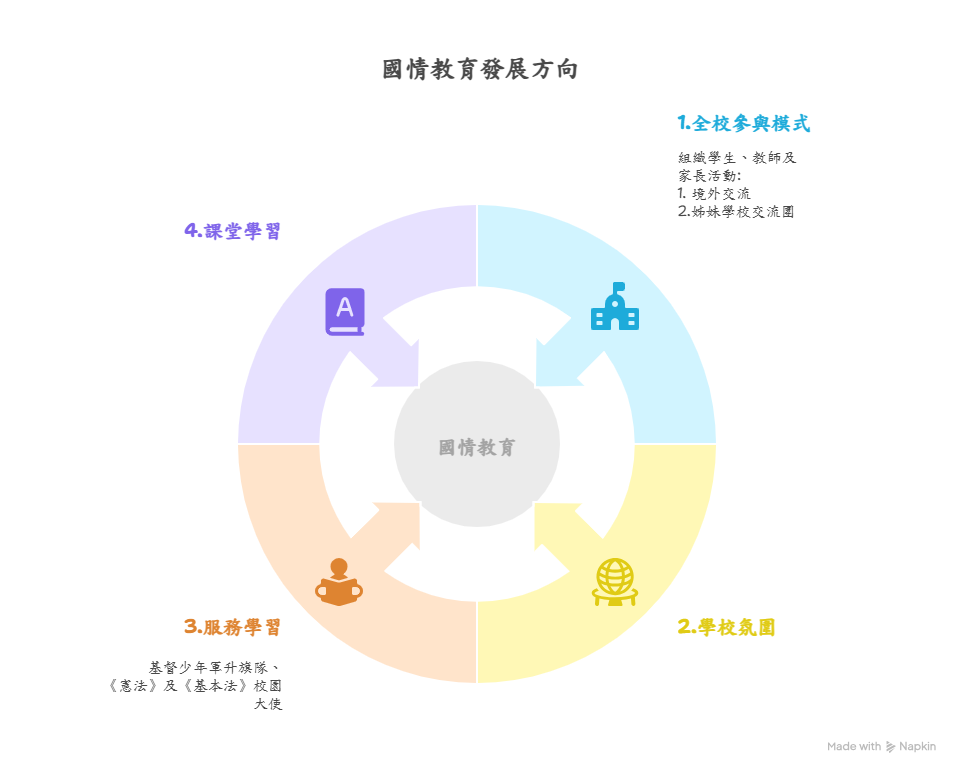 - 以《小學教育課程指引》(2024)為指引,持續以 「 有機結合」、「自然連繫」、「多元策略」、「互相配合」、「課堂內外」、「 全校參 與 」的方式,積極在課堂內外推動國民教育和國家安全教育,培養學生正確的價值觀和態度,加強他們的文化自信、國民身份認同及愛國情懷。